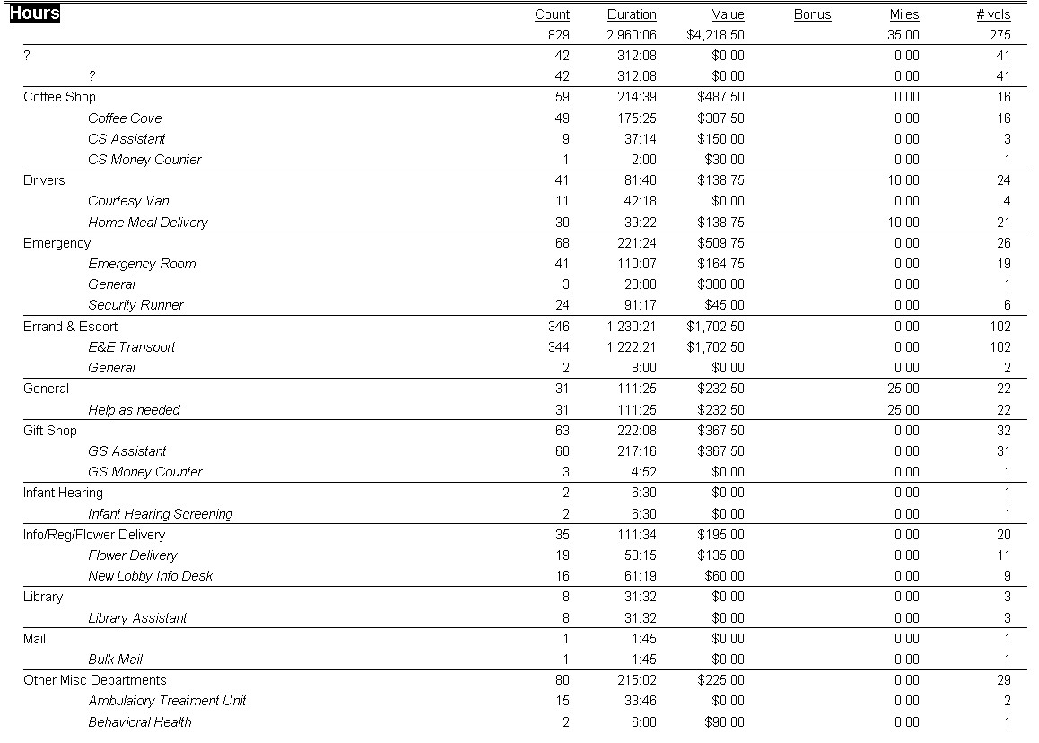 By job group and job, Count (number of hours record), Duration (sum of hours records durations), Value (dollar value of these hours), Bonus (sum of bonus hours), Miles/kilometers and # vols (number of unique volunteers who were credited with these hours). |