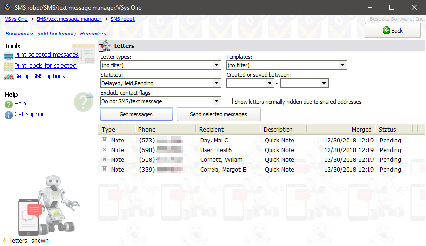 Click on the Get messages button. Only letters which meet your criteria, are associated with people who have a valid SMS number, and are not associated with people marked as "Do not SMS" will appear here.