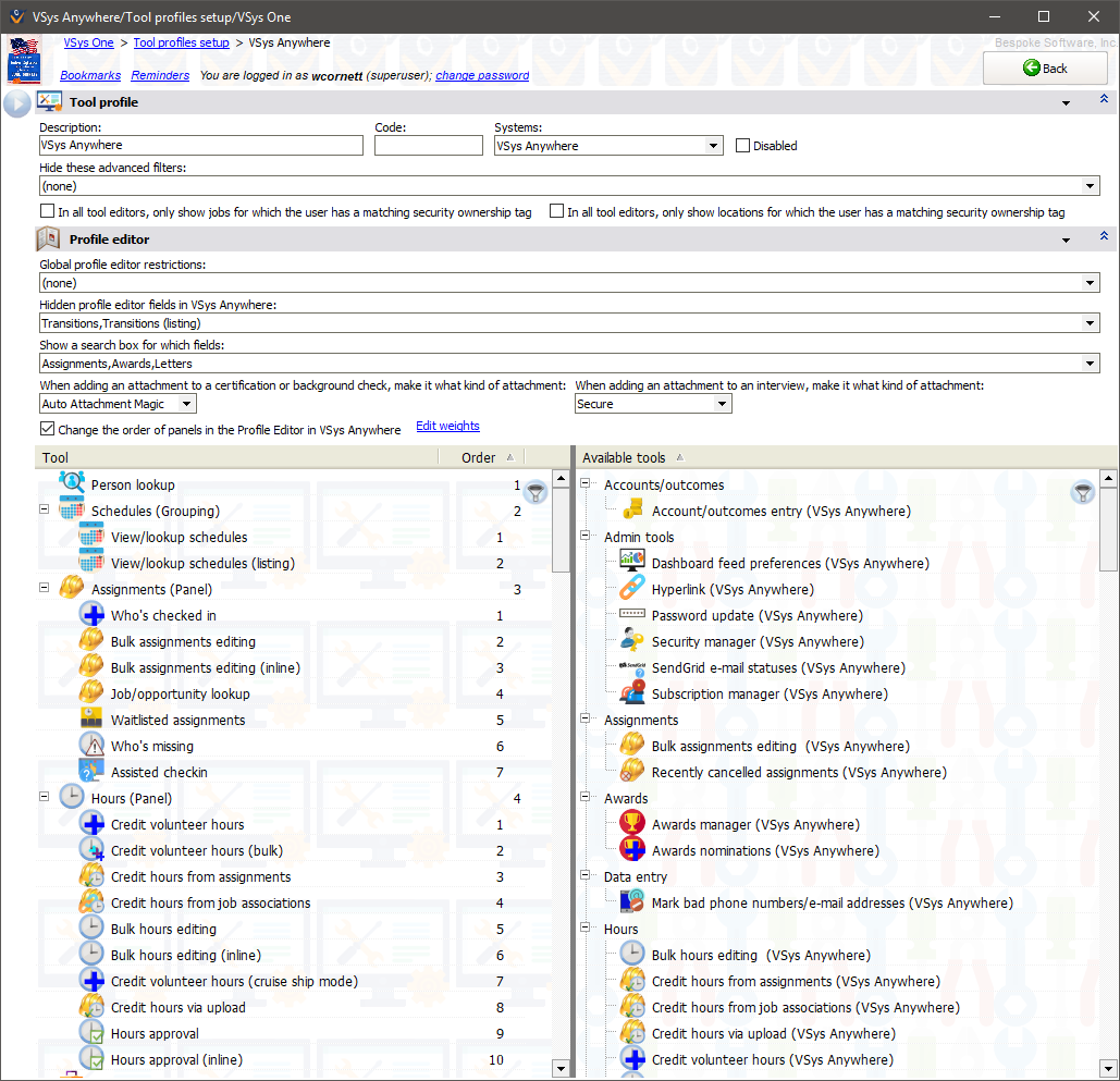VSys Anywhere tool profiles work exactly the same way that VSys One and VSys Live tool profiles do: add and configure tools that you want to give access to.