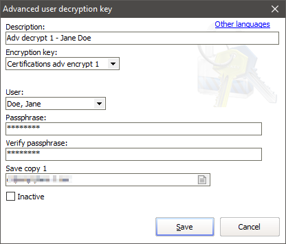 Click on an existing user key to modify it. Note that you can only change the Description and Inactive properties- not the Encryption key or User at this point. Disable a key by marking it Inactive and saving it.